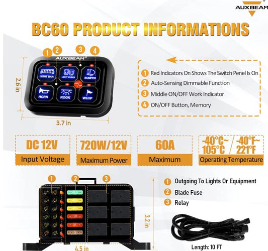 BC60 6 Gang LED Switch Panel, Off Road Light Controller (Blue)